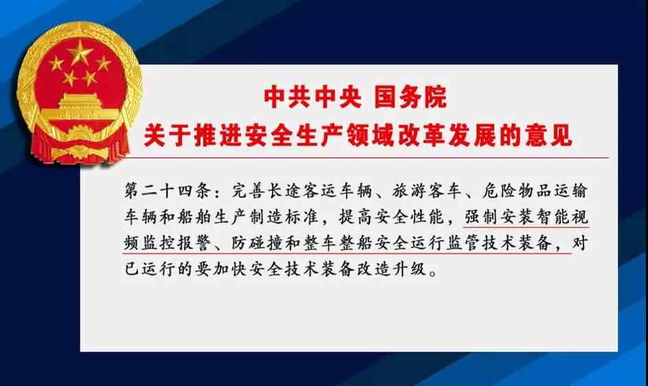 2016年,中共中央国务院改革发展意见中提到,强制安装智能视频监控报警、防撞系统和整车整船安全运行监管技术装备后,海南、甘肃、江苏等省份也陆续颁发强制安装防撞系统的指令,河南省也出台相关政策,其中洛阳等地已创建强制推行客运班车、旅游包车、危险物品运输车辆视频监控、汽车防撞器等技术装备的计划。